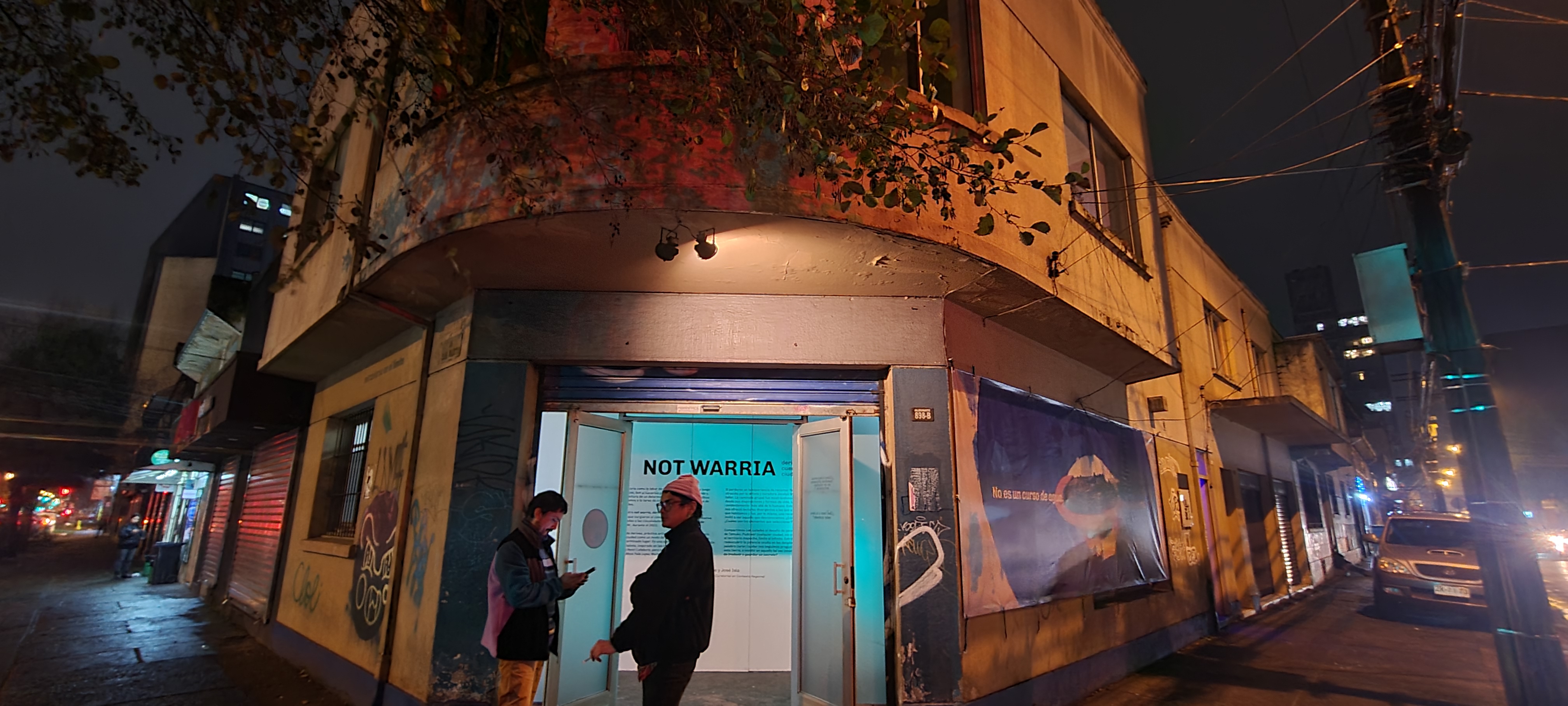 Espacio Kom funciona en una esquina de la periferia céntrica de Temuco y cuenta con dos espacios habilitados en el primer piso para exposiciones, presentaciones y talleres. En el segundo piso, está la casa que cobija las oficinas y otros espacios más íntimos para reuniones y desarrollo de procesos creativos de diversa índole. En la imagen, una noche en la muestra Not Warria: derivas, cuerpo, ciudad, proceso de cierre de la segunda edición del proyecto Curatorial en contexto. Foto: Espacio Kom.