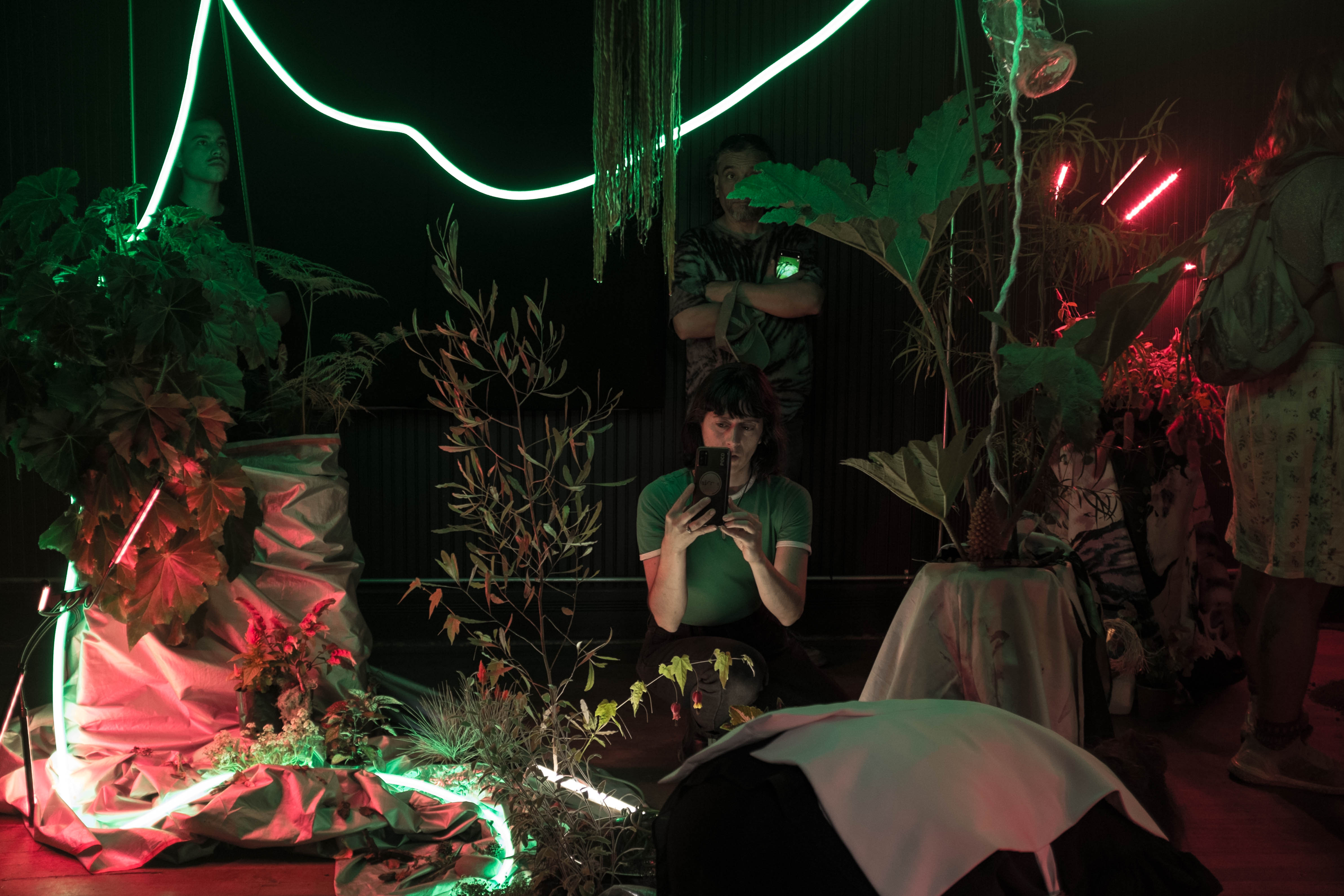 Casa Varas es un proyecto con una línea curatorial centrada en el arte contemporáneo que abrió sus puertas el 2021 guiado por tres arquitectas de Temuco. Han realizado todo el arduo proceso de restauración del espacio, una casona de inicios del siglo xx, a través de “mingas” y colaboraciones voluntarias. En la imagen, la inauguración de la instalación Fitopía, una experiencia estético-inmersiva creada por el dúo Detrás del Futuro. Foto: Magdalena Aguirre.