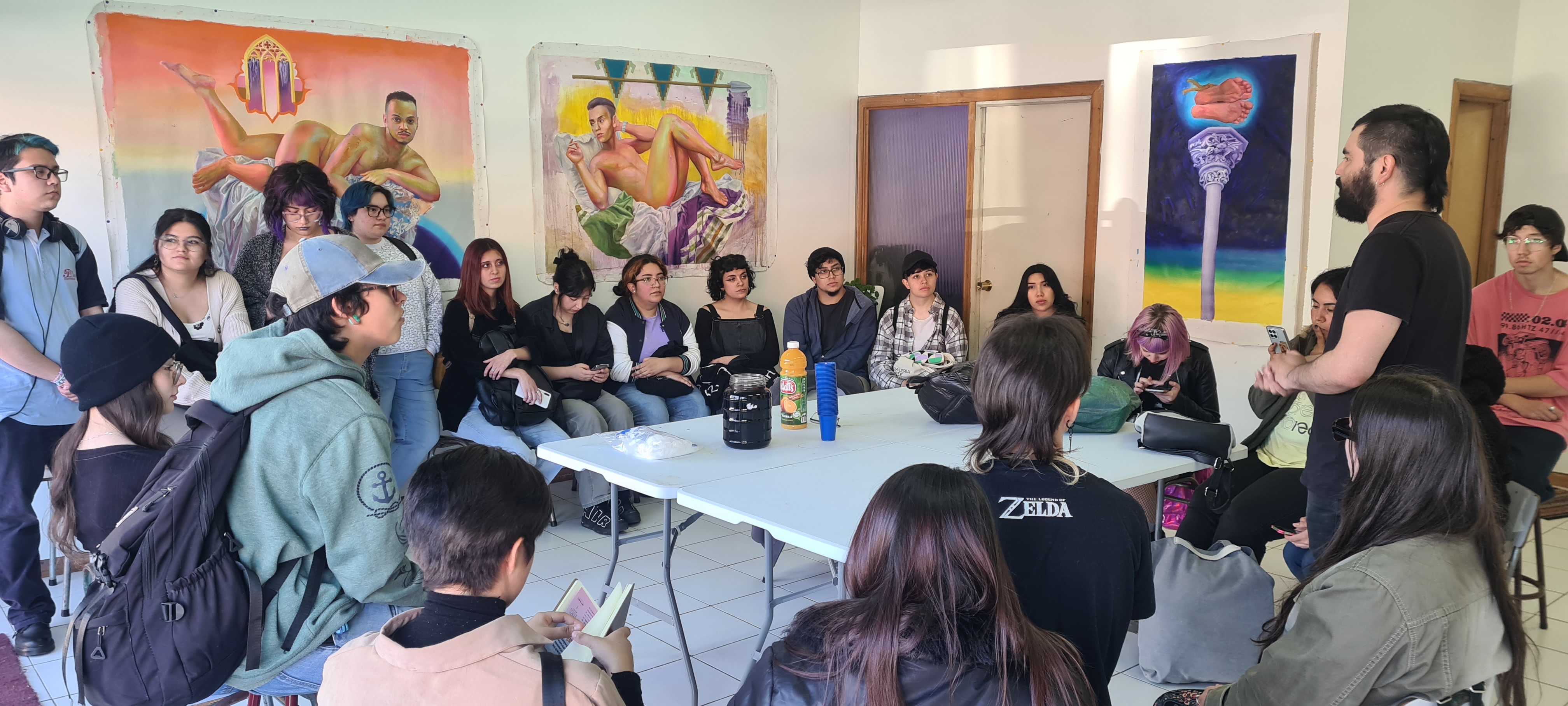 La palabra Kom en mapuzugun significa ‘todo(s), entero, completo’ y fue elegida como nombre para este espacio por la orientación abierta y comunitaria que su equipo desea plasmar en el proyecto. En la imagen, el escritor y docente Patricio Alvarado Barría realiza una mediación artística para los estudiantes de la carrera de Artes de la Universidad Católica de Temuco en el marco de la exposición Cuerpos de nácar de Pablo Lincura. Foto: Espacio Kom.
